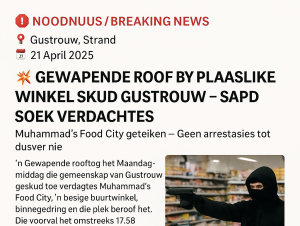 Gustrouw:- Die Strand Gemeenskaps Polisieforum (GPF) het Maandag, 21 April, bevestig dat ’n gewapende besigheidsroof omstreeks 17.58 by Muhammad’s Food City in Gustrouw, Strand, plaasgevind het.