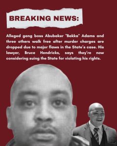 Mitchells Plain:- In a dramatic turn of events, Abubaker “Bakka” Adams, the alleged leader of the feared Fancy Boys gang, walked out of the Mitchells Plain Magistrates Court a free man on Thursday, after murder charges against him and three co-accused were struck off the roll.