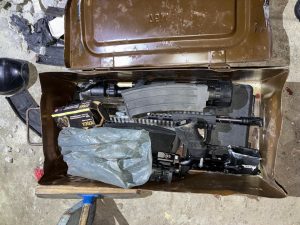 Die beamptes het die beton met ’n voorhamer stukkend geslaan en die staalboks ontdek wat in die grond begrawe was. Die boks het verskillende kaliber vuurwapens, ammunisie en plofstowwe bevat.